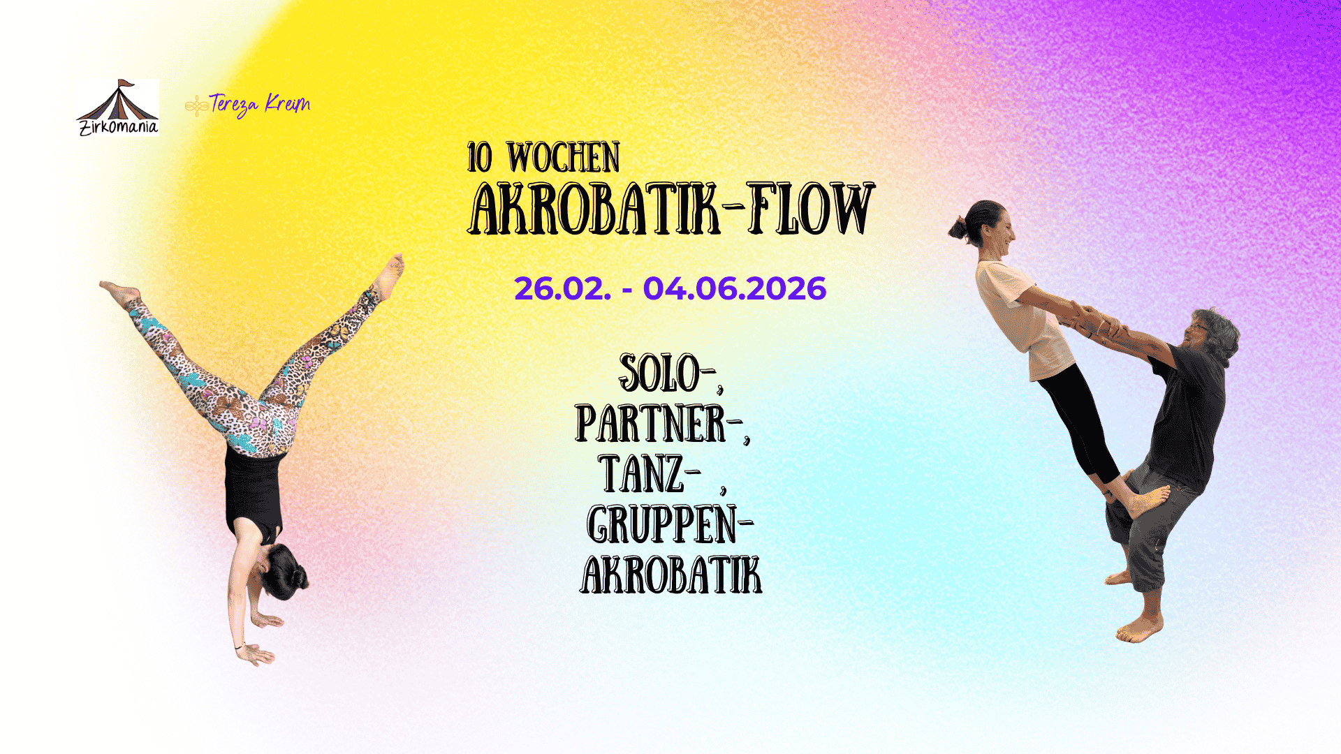 Der Kurs „10 Wochen Akrobatik-Flow“ ermöglicht dir einen spielerischen und soften Einstieg in die Akrobatik. Hier sind vielbewegte Personen genauso willkommen wie selbsternannte „Körperclowns“ die Lust auf Spaß, kreative Bewegung und ein verbes- sertes Körpergefühl haben.